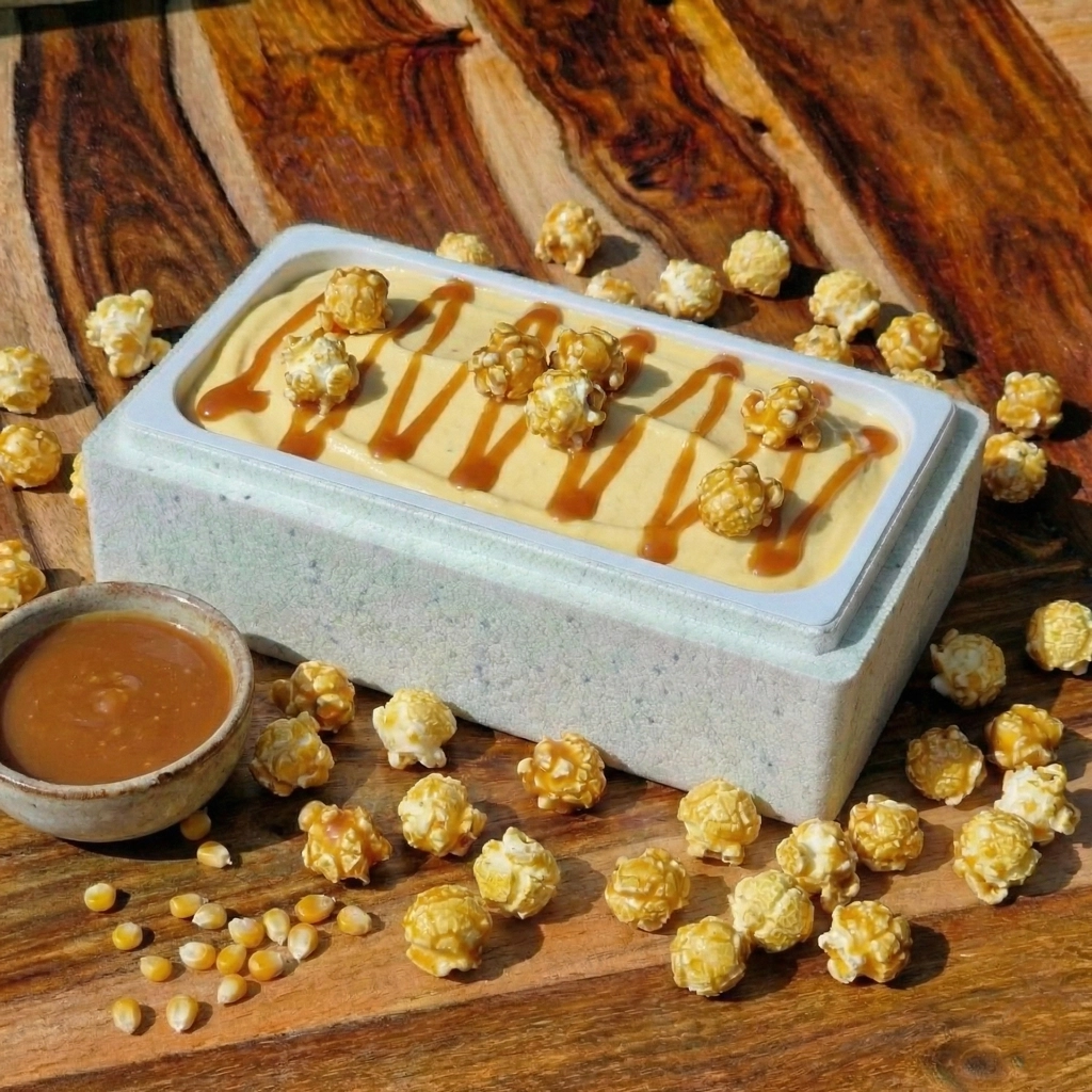 An absolutely addictive combination. Smooth popcorn gelato with swirls of salted caramel sauce and crunchy pieces of popcorn. After this, you'll never go back to ordering 1 flavor of popcorn again!